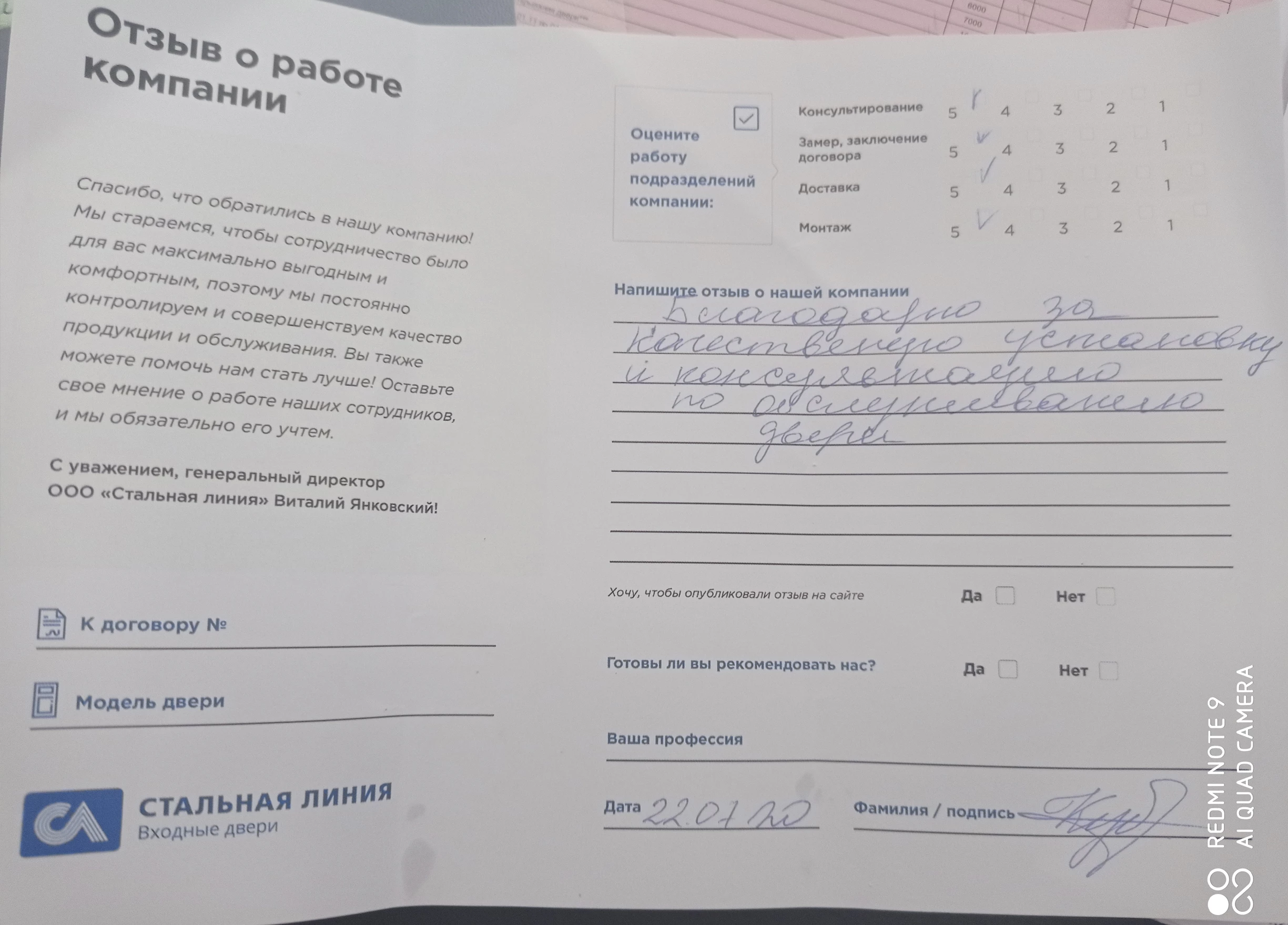 Благодарю за качественную установку и консультацию по обслуживанию двери.