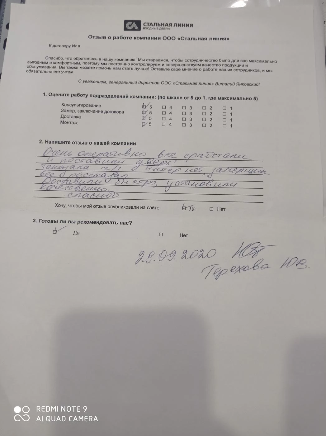 Очень оперативно все сработали и поставили дверь. Заказала ч/з интернет, замерщик все рассказал. Доставили быстро, установили качественно. Спасибо