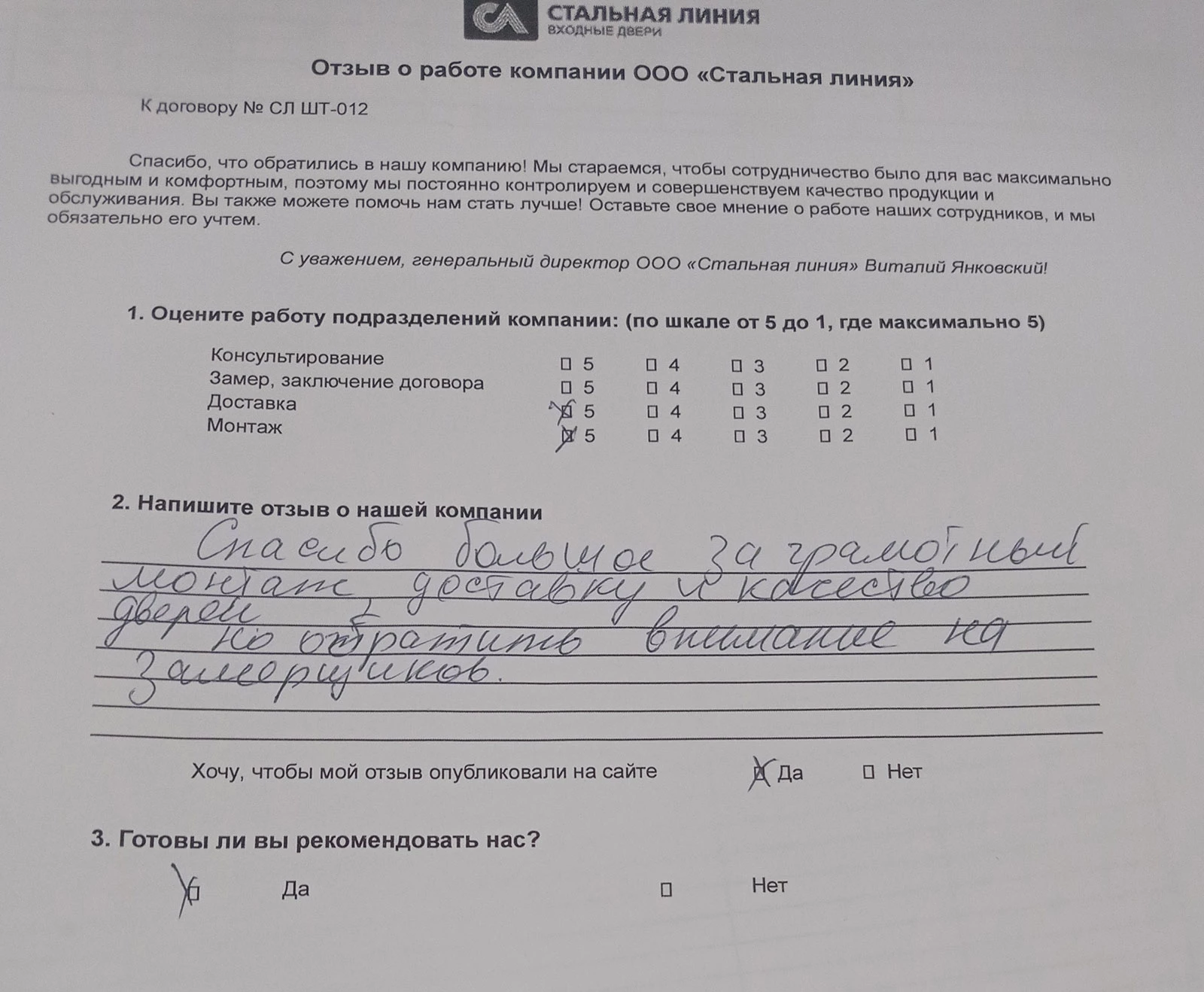 Спасибо большое за грамотный монтаж, доставку и качество дверей. Но обратить внимание на замерщиков.