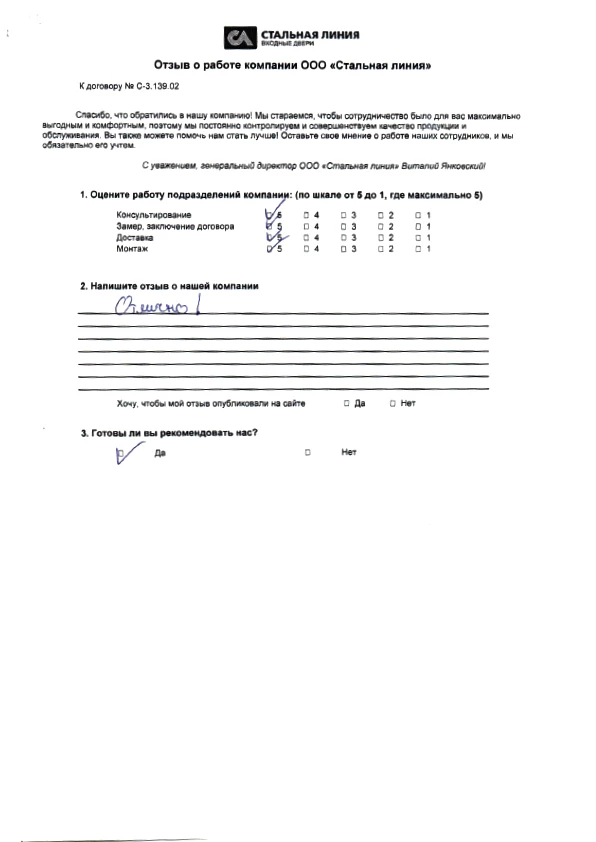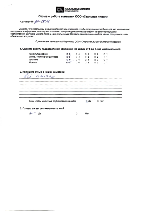 Спасибо огромное за быстрое и качественное выполнение работ по установке двери, а также за вежливое и уважительное отношение к клиентам. Еще раз спасибо!!!